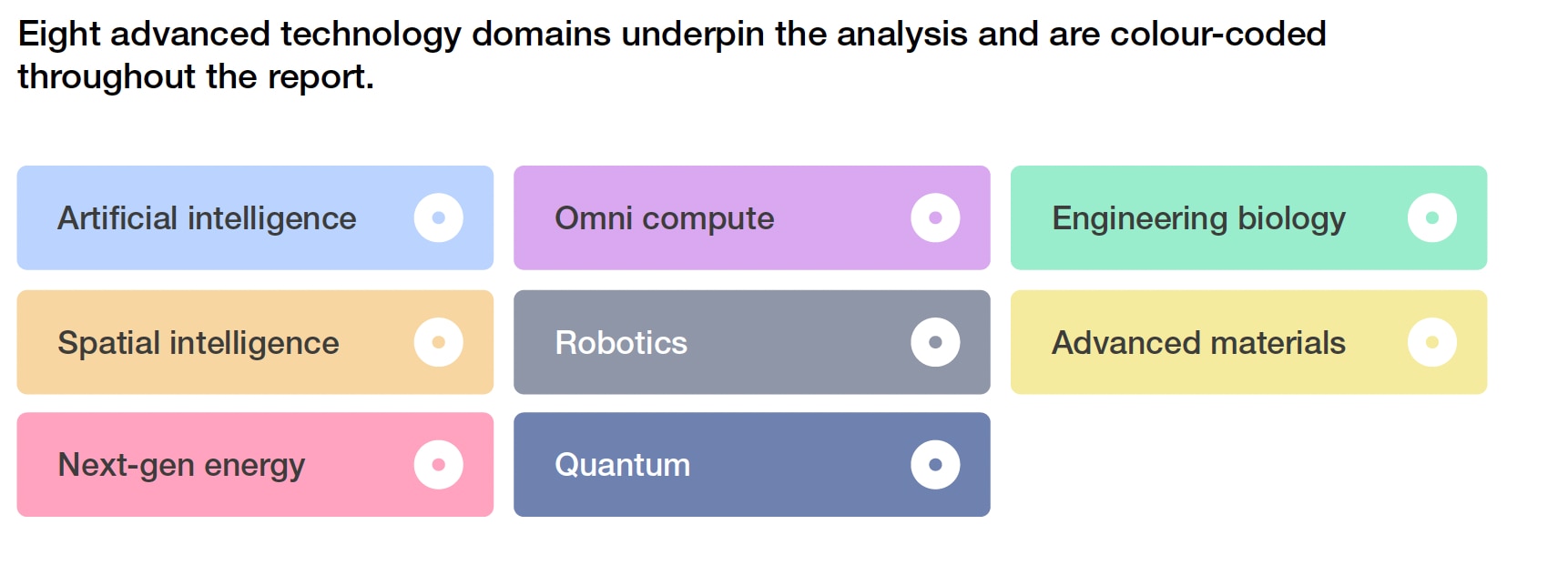 Today, convergence is taking place across eight advanced technology domains. Charting their developments can help organizations layer the possibilities against their own technological infrastructure or identify where peers or adjacent organizations may innovate.