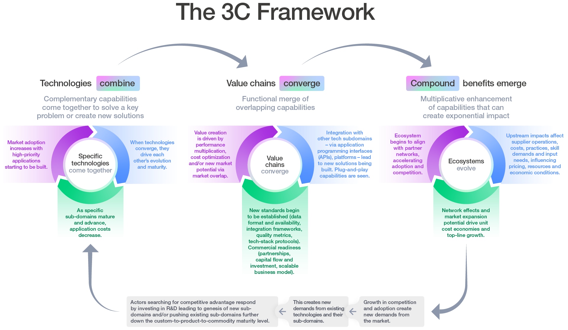 The 2025 Technology Convergence Report introduced the 3C Framework: combination, convergence and compounding. A natural reading treats these as sequential stages. Technologies combine, value chains converge around them and capabilities compound through adoption. This reading is intuitive but incomplete. The 3Cs operate as an interconnected system, not a linear sequence.